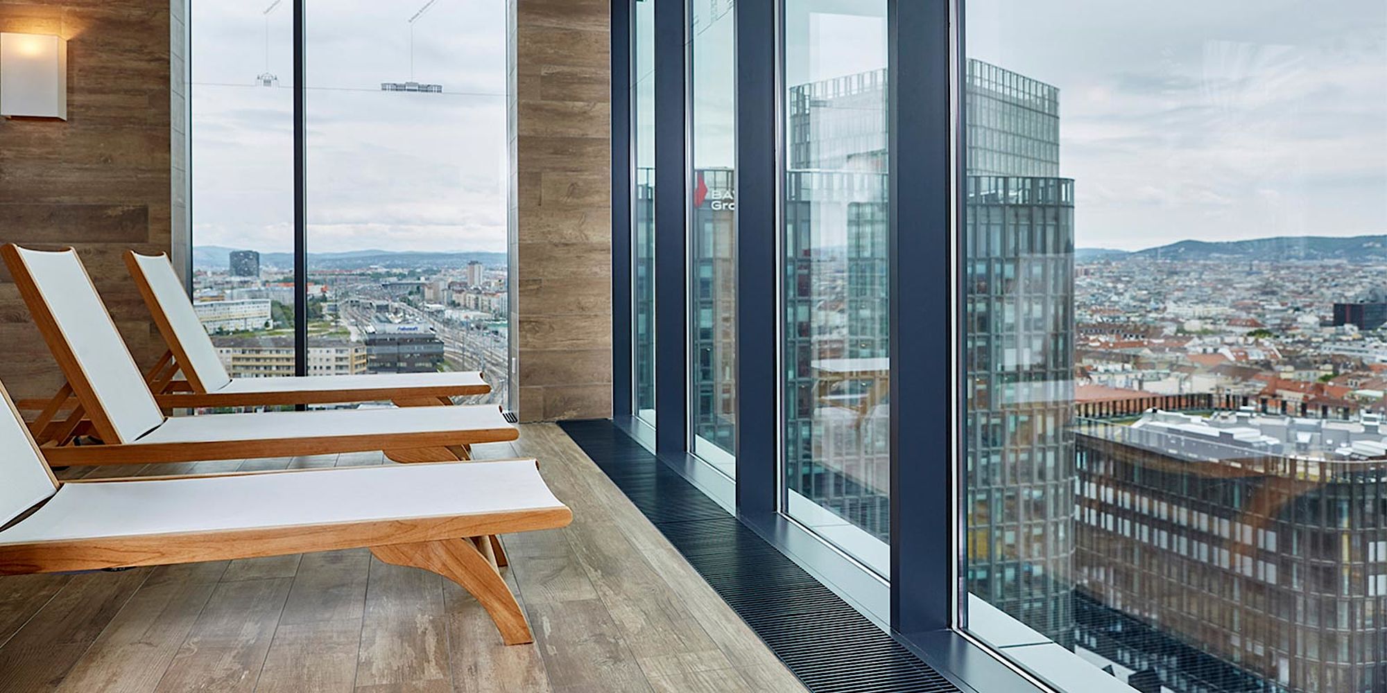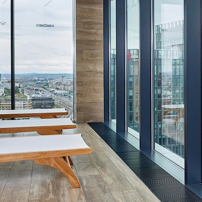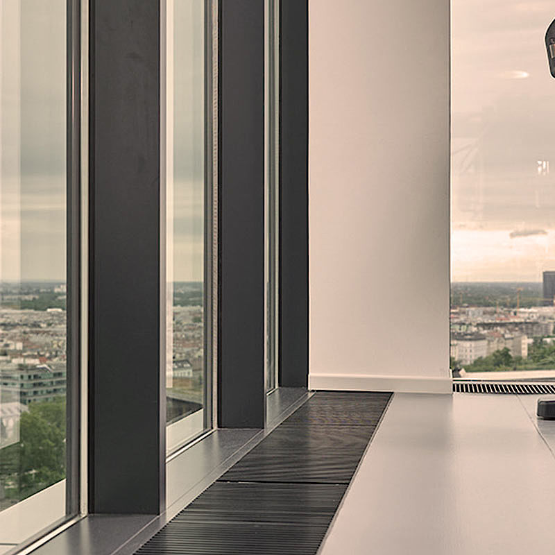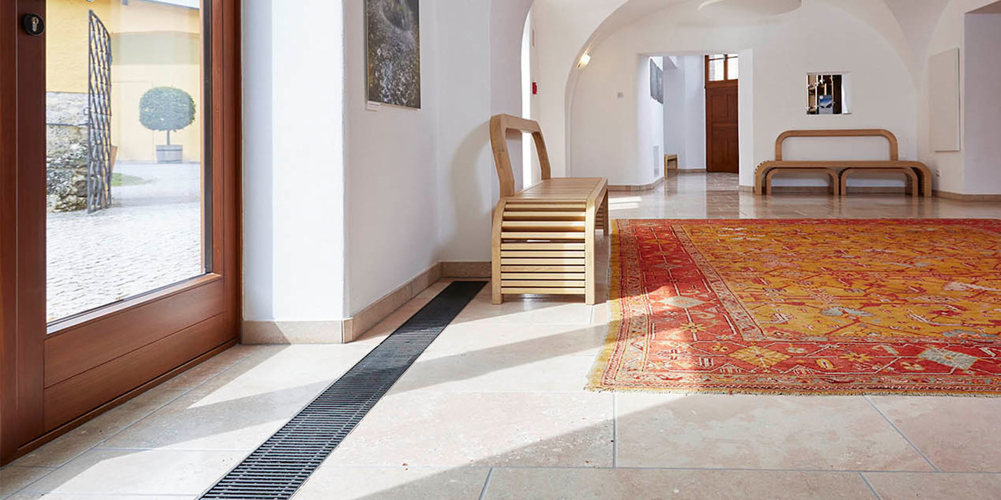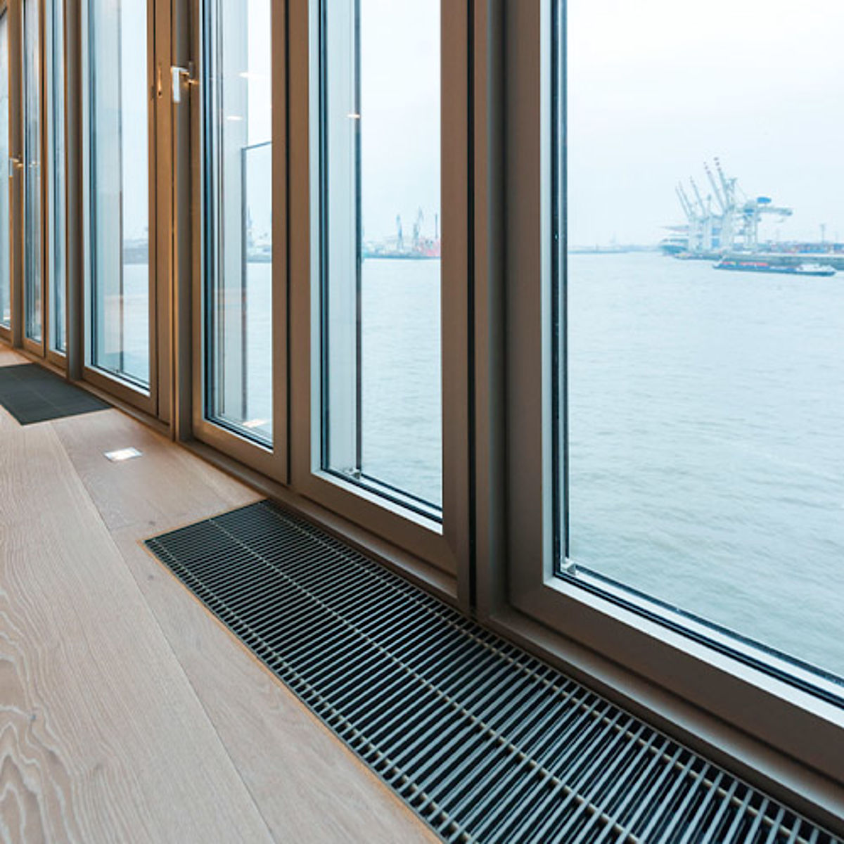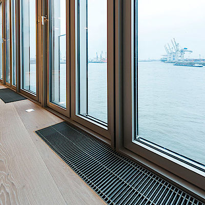 Durch die moderne und fast unsichtbare Integration der Heizkörper in den Boden bleiben die großen Fensterfronten unverstellt und ermöglichen so eine elegante Innenraumgestaltung. Die Systemelemente eröffnen Architekten dabei auch vielfältige Gestaltungsmöglichkeiten.