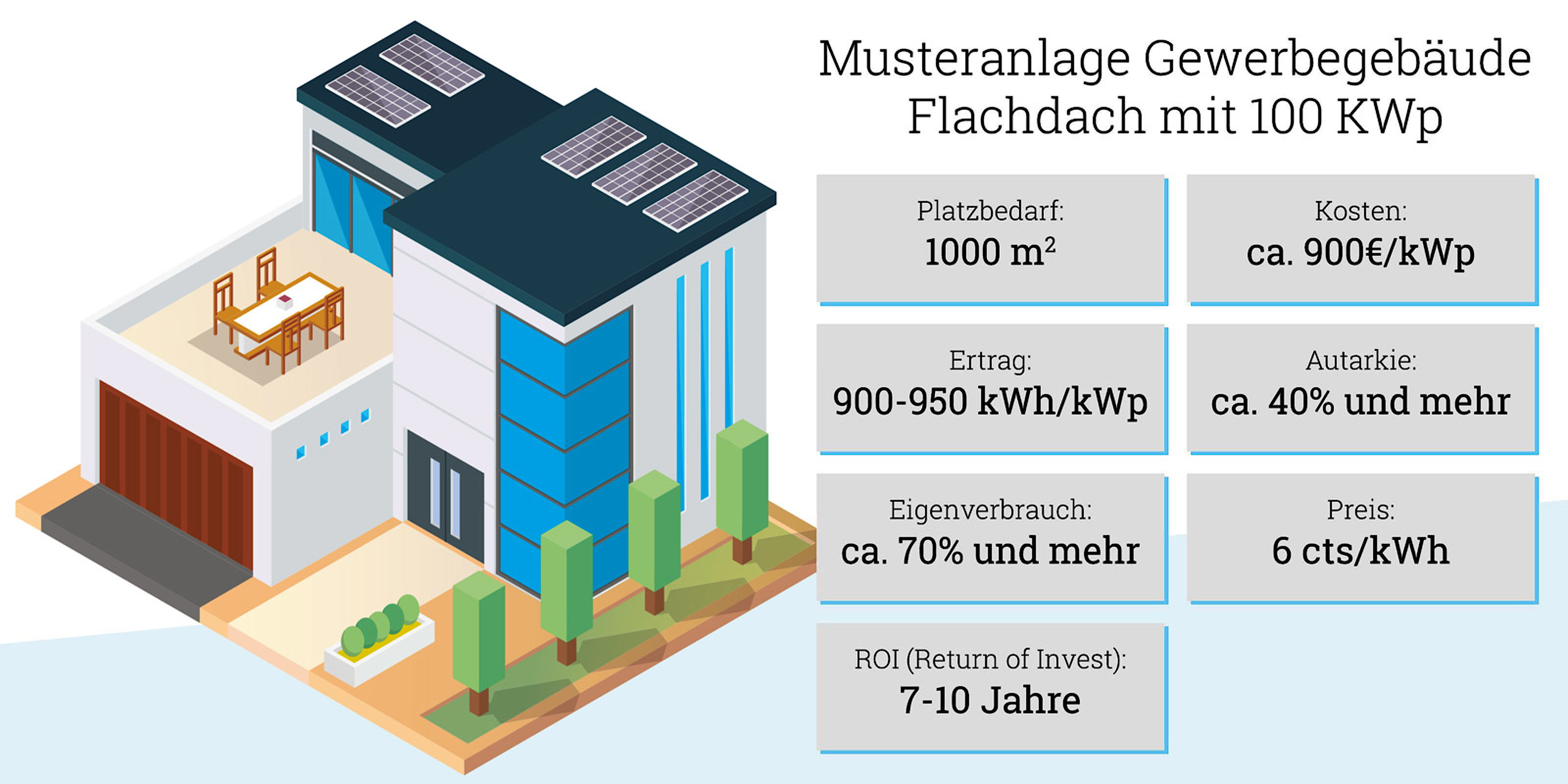 Solarstrom vom Dach ist heute wirtschaftlich attraktiv für Gewerbe- und Industriebetriebe. Und das aus gutem Grund. Denn eine Photovoltaik-Anlage in der gewerblichen Nutzung trägt nicht nur dazu bei, die Ziele der EnEV zu erfüllen, sie reduziert auch Ihren Strombezug aus dem öffentlichen Netz. Dabei sind die Kosten zur Erzeugung von Strom mit einer Photovoltaik-Anlage meist deutlich geringer als der Netzstrom. Der von der Photovoltaik-Anlage überschüssig produzierte Strom kann zudem ins Netz eingespeist oder verkauft werden.