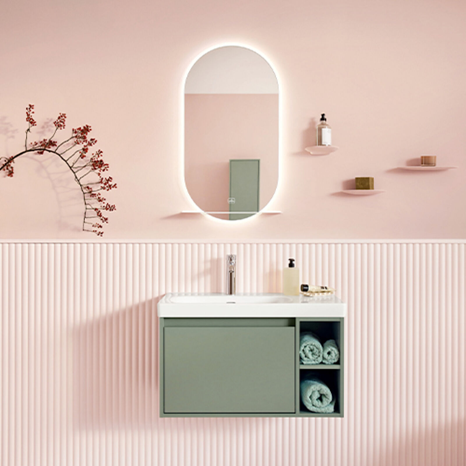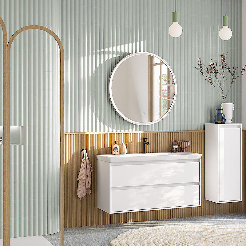 Die Vielseitigkeit von Skyla zeigt sich an der breiten Farbpalette und den flexiblen Größenoptionen. Acht moderne Farbtöne – von klassischem Brillant White über sanftes Soft Green bis hin zu warmem Nordic Oak – eröffnen zahlreiche Möglichkeiten für individuelle Looks. Auch bei den Größen bietet Skyla Spielraum: Mit sechs Varianten (von 55 bis 120 cm) passt sich der Schrankwaschtisch ideal an jede Raumgröße an. Auf Wunsch sind die Unterschränke mit einer oder zwei Schubladen erhältlich, wobei die Modelle in den Breiten 80 und 100 cm zusätzlich mit einem offenen Fach kombiniert werden können – die perfekte Ergänzung zum asymmetrischen Waschbecken.