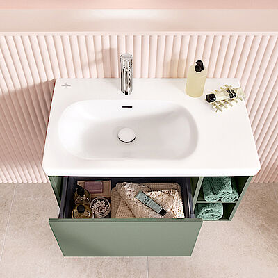 Dreh- und Angelpunkt von Skyla ist der Waschplatz: Hier treffen sich minimalistische und organische Formen, dezente Asymmetrien, clevere Stauraumlösungen und designstarke Möbelfarben. Die Waschtische verbinden geschickt unterschiedliche Formen und finden so den perfekten Mittelweg: Die klaren Außenlinien werden durch die sanfte Rundung des Waschbeckens aufgebrochen. Durch die asymmetrische Anordnung entsteht ein Effekt, der nicht nur gut aussieht, sondern auch für praktische Ablagefläche sorgt. Innenliegende Fronten und dezente Griffmulden verleihen den Badmöbeln eine klare, aufgeräumte Ästhetik, während der sanfte Übergang vom Waschtisch zum Unterschrank die ruhige Formensprache noch weiter unterstreicht. Das Ergebnis ist ein harmonisches Design, das sich mühelos in verschiedenste Wohnstile integriert – und trotzdem seinen ganz eigenen Akzent setzt.