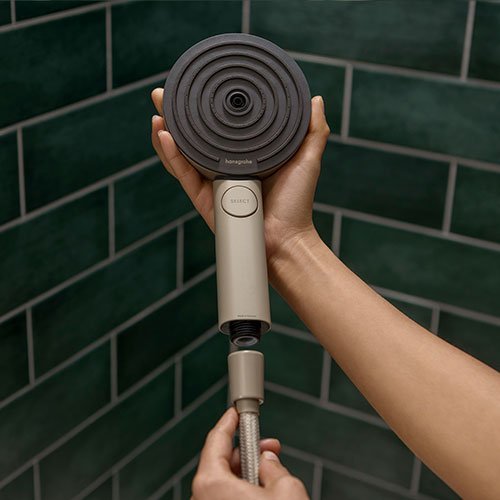 So schließt sich der Kreislauf: Getreu dem Nachhaltigkeitsprinzip „Reduce, Reuse, Recycle“ besteht der Griff der Handbrause aus einem Kunststoffrezyklat. Der einzigartige Prozess für die Gewinnung dieses Rohstoffs wurde speziell bei Hansgrohe entwickelt. Dieser aus Altprodukten und Ausschussware gewonnene ABS (Acrylnitril-Butadien-Styrol-Copolymer) beschichtete Kunststoff wird zerkleinert und gereinigt. Anschließend folgt die Umwandlung in ein hochwertiges Granulat. Mit dieser Alternative zu erdöl- und fossilbasierten Primärkunststoffen gelingt eine erhebliche Senkung des Energieverbrauchs bei der Produktion. Das Material selbst bietet eine elegante Optik in Sandfarben. Die Handbrause ist komplett chromfrei gefertigt. Alle eingesetzten Rohstoffe sind recyclebar.