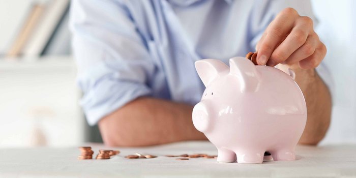 2. Ein Sparschwein das auf einem Heizkoerper steht und eine Hand Kleingeld in den Schlitz steckt